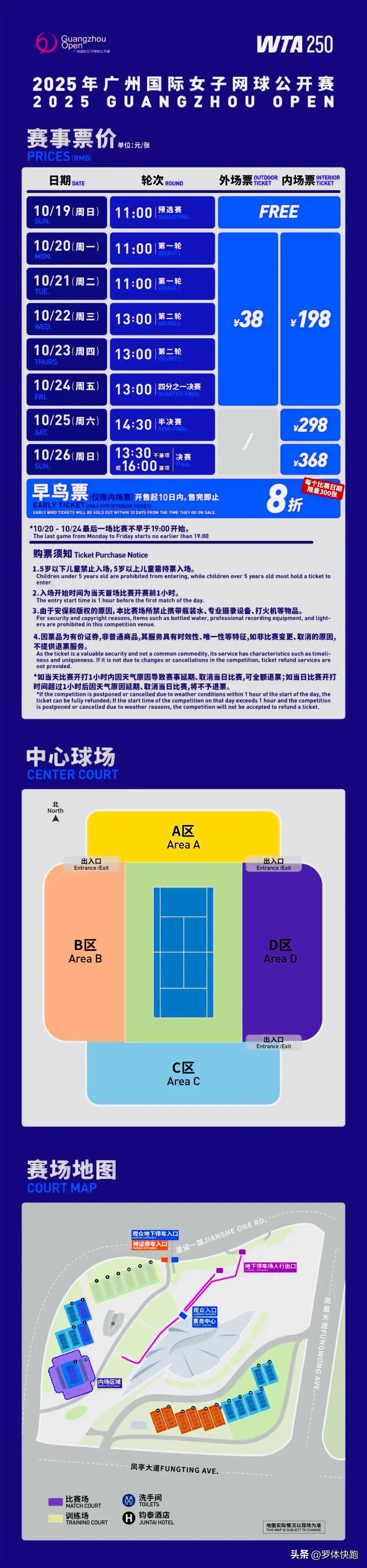 W非常新消息250广州国际女子网球公开赛单打资格赛将于10月19日和20日两天举行,正赛从10月20日开打,10月25日展开半决赛的争夺,单、双打决赛和颁奖仪式将于10月26日举行;10月19日单打资格赛首轮观众可免费进场观赛,今年广网还增设了外场票,正赛的前五天10月20日-24日,每天的外场票仅需38元,如今还有早鸟套票出售,感兴趣的球迷不要错过!
