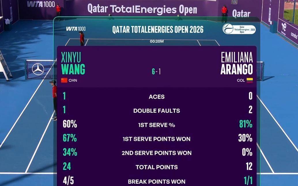 首盘的技术统计清晰地显示了王欣瑜的优势。她发出了1记ACE球,出现1次双误,对手有2次双误。虽然王欣瑜的一发进球率只有60%,低于阿朗戈的81%,但她的发球得分效率极高。在一发得分率上,王欣瑜达到67%,而阿朗戈只有30%。在二发得分率上,王欣瑜为34%,阿朗戈的该项数据则为0。整盘总得分,王欣瑜以24比12领先,正好是对手的两倍。