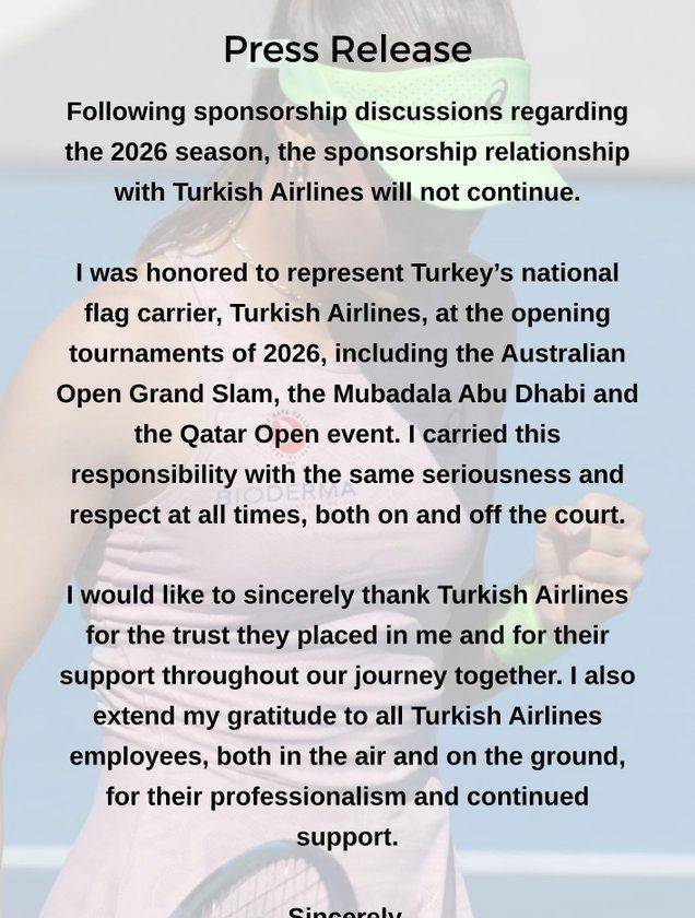 2月14日,索内兹在社交媒体上郑重宣布:“在就2026赛季的赞助事宜进行深入沟通后,我与土耳其航空的赞助合作将就此结束。”她表达了能够代表土耳其国家航空公司参加2026赛季揭幕赛事的光荣,并对土耳其航空一直以来的信任、支持以及全体员工的专业精神致以诚挚的感谢。
