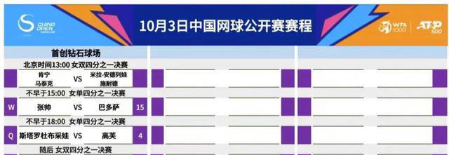根据中网官网显示,3日下午1点开始是女双1/4决赛,接下来备受关注的张帅的比赛将在15点之后进行。